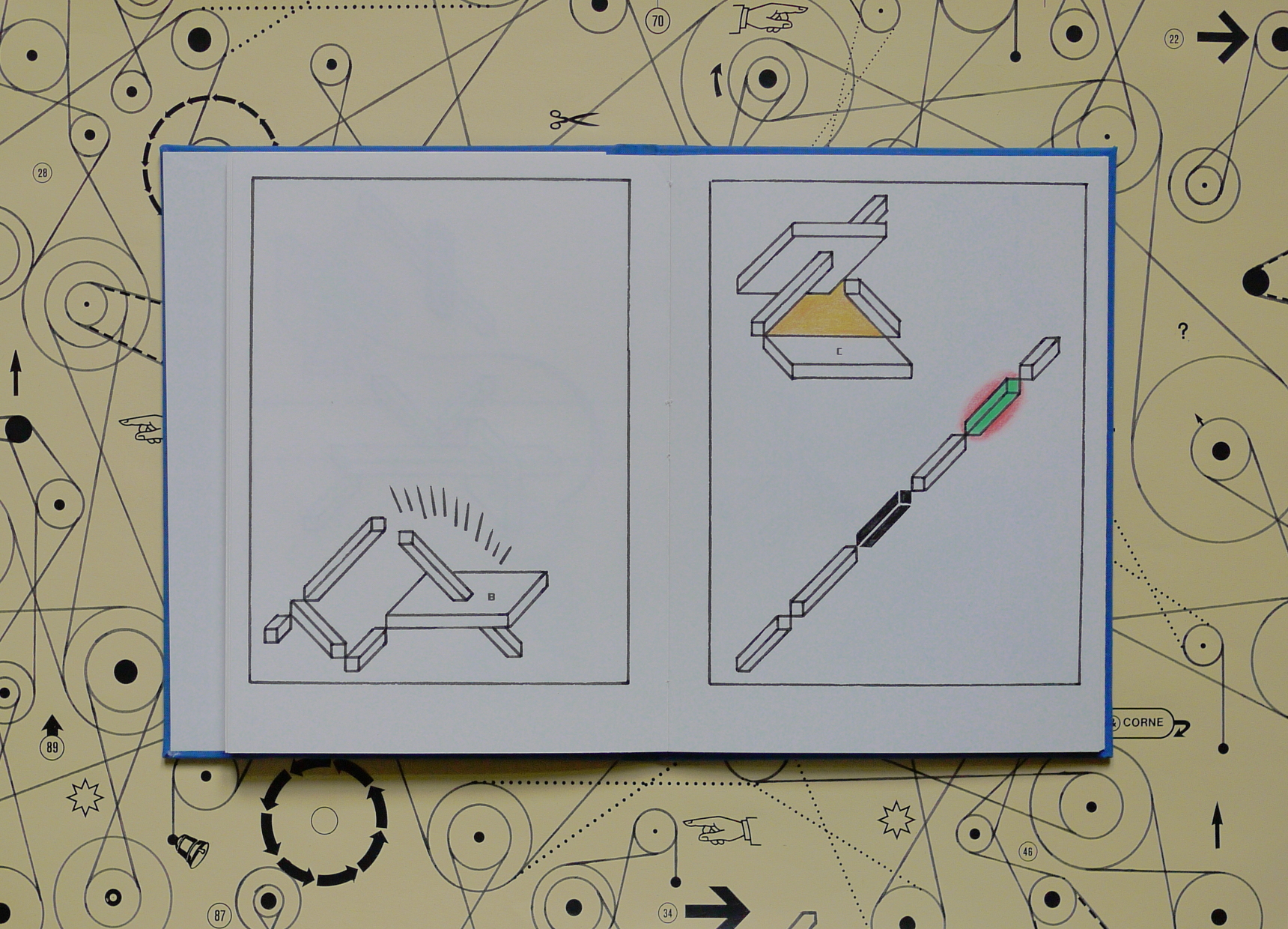 Cahier de dessin, novembre 2012, 26 pages, 22 centimètres sur 17 centimètres, Rivoli blanc 160 grammes, 26 dessins à l'encre, crayons de couleur, cousu, couvrure en toile de couleur bleu de travail, premier plat imprimé, étui imprimé.
