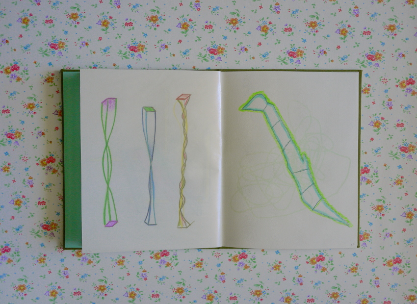 Cahier de dessin, mars 2013, 24 pages (23 pages dessinées et 1 page imprimée), 22 centimètres sur 17 centimètres, Ingres école 120 grammes, cousu, couvrure en toile de couleur vert Véronèse, premier plat imprimé, étui imprimé.