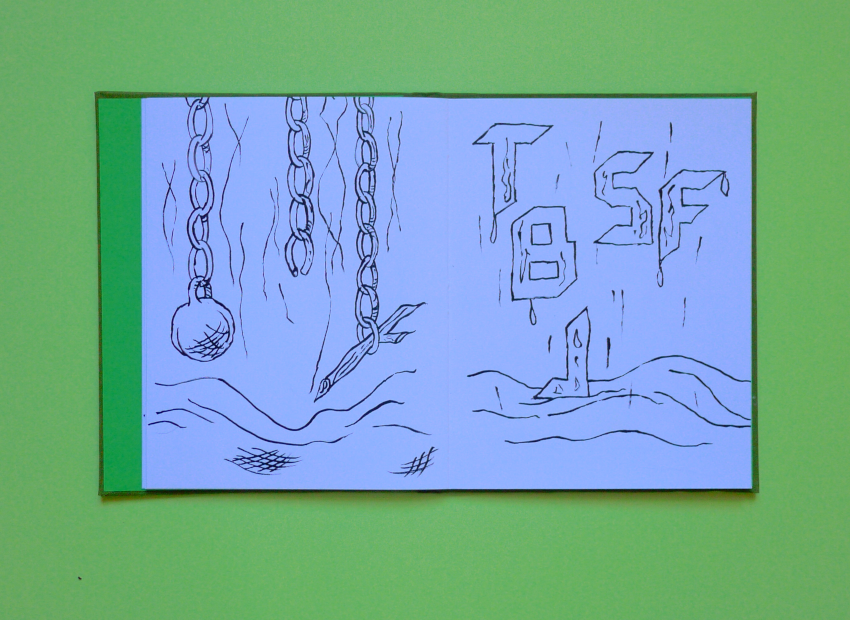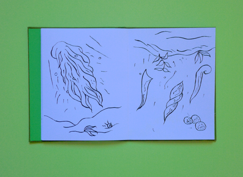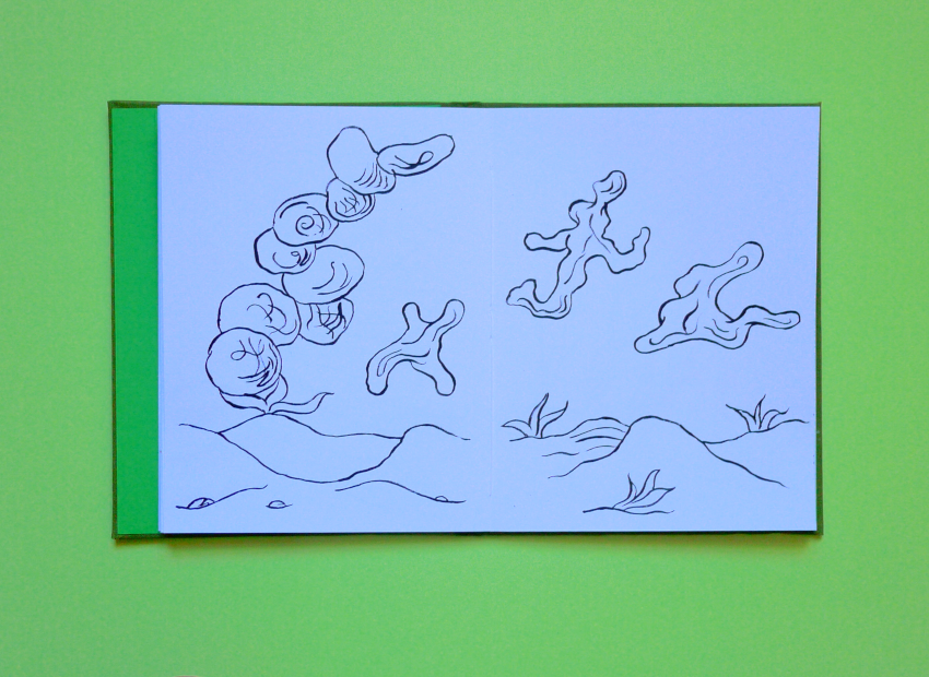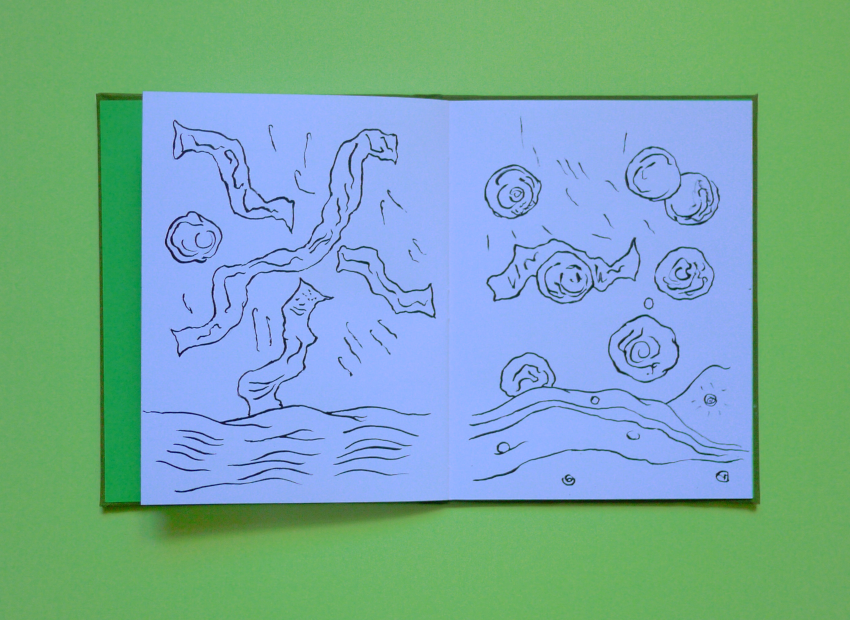 Cahier de dessin, début mars 2026, 20 pages, 22 centimètres sur 17 centimètres, papier Canson blanc 160 grammes, 20 dessins à l’encre noire, couvrure en toile de couleur vert poire, premier plat imprimé, étui papier vert feuille 300 grammes, imprimé.