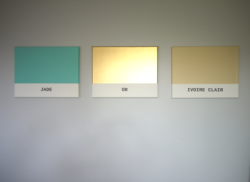 Ensemble de trois tableaux formant une phrase, 40 centimètres de hauteur sur 50 centimètres de largeur chaque tableau, mai 2023, peinture acrylique et impression en sérigraphie sur toile.