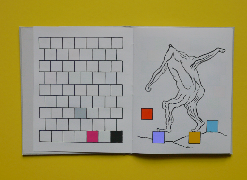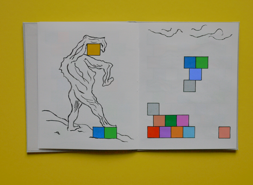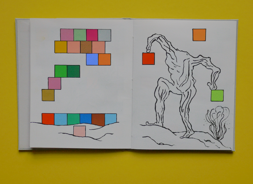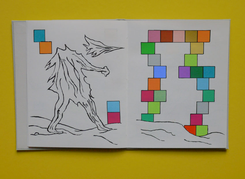 Cahier de dessin, début décembre 2025, 20 pages, 22 centimètres sur 17 centimètres, papier blanc 125 grammes, 20 dessins à la peinture vinylique et acrylique, couvrure en toile de couleur gris clair, premier plat imprimé, étui imprimé.